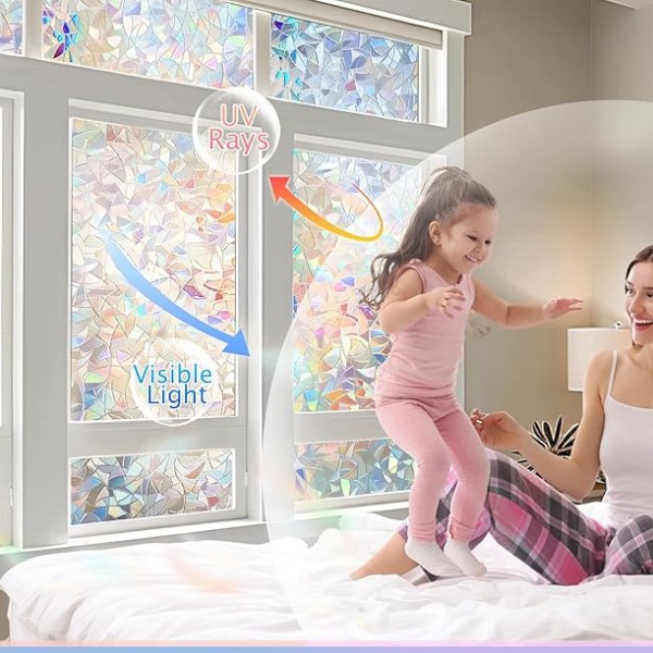 Când lumina soarelui pătrunde prin folie, aceasta creează un spectacol fascinant de culori în întreaga încăpere, fără a bloca lumina naturală. Această folie funcționează în orice cameră – living, baie, birou și chiar uși din sticlă – ceea ce o face o soluție completă pentru diferite spații.