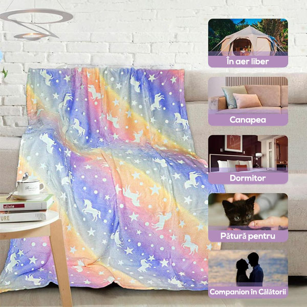 O pătură călduroasă și confortabilă care emite lumină în timpul nopții! Poți alege între un model cu unicorni sau cu dinozauri!