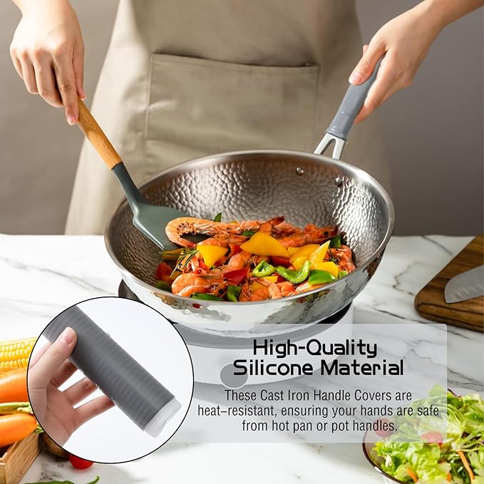 Protecțiile noastre din silicon sunt concepute pentru a fi compatibile cu o gamă largă de dimensiuni de mânere de oale și tigăi, ceea ce le face accesorii de bucătărie versatile și adaptabile, perfecte pentru tigăile din fontă și tigăile cu fund plat.