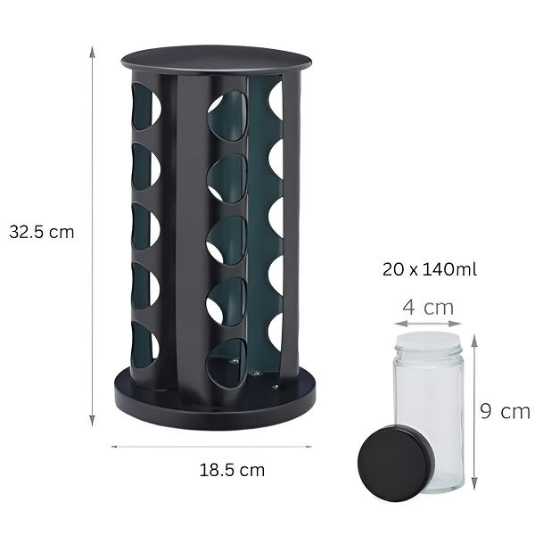 📦 Pachetul include: 1x Raft pentru condimente, 20x Borcane de sticlă cu capace negre etanșe